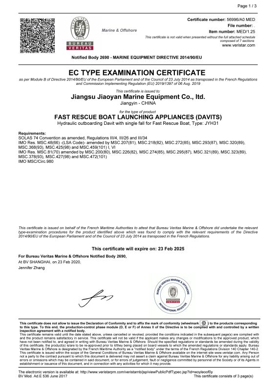 We, JIANGSU JIAOYAN Marine Equipment Co., Ltd is very proud to announce that we have completed the sea condition test of the fast rescue boat launching appliance in accordance with the supplementary requirements of the high speed boat launching appliance in the LSA Code (8.1.8 - Part 1 of LSA Code) and obtained the type approval of BV classification society.
