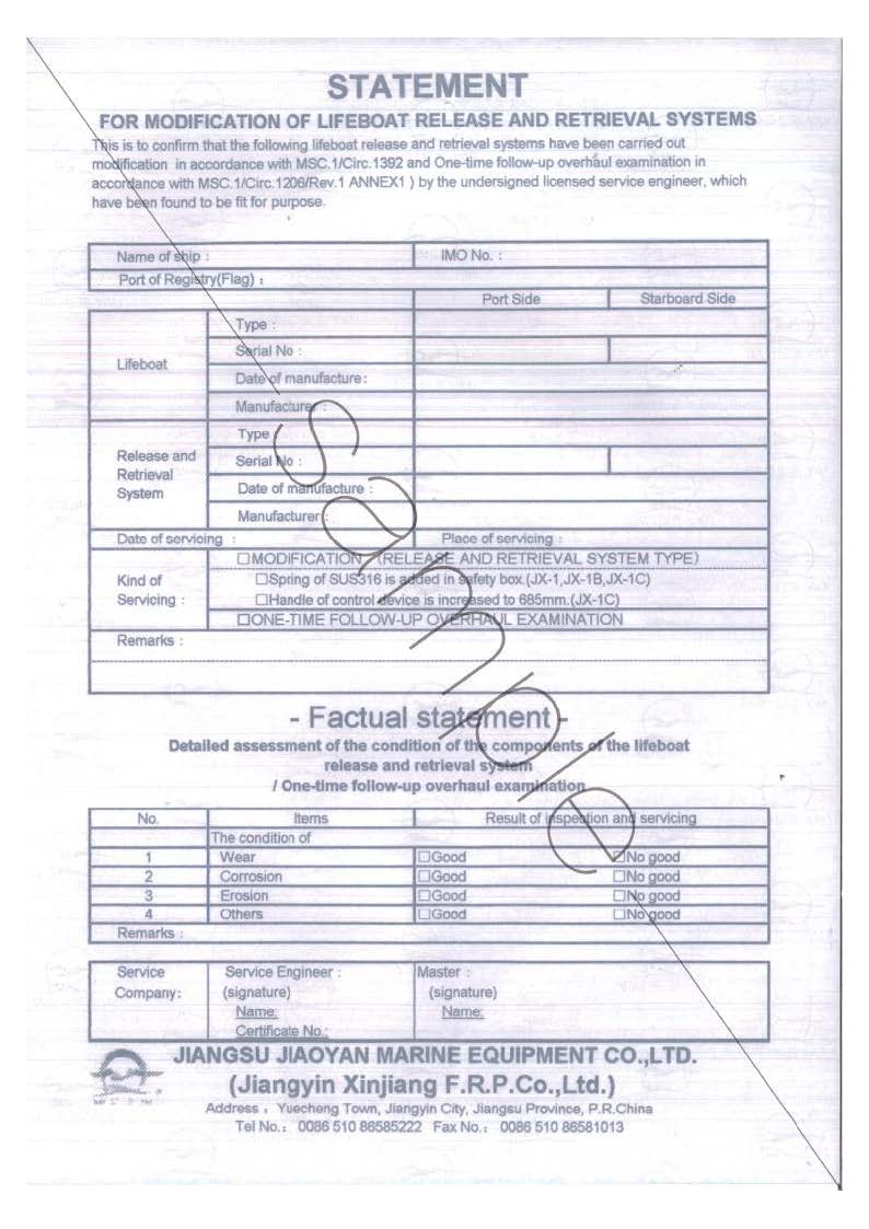 近期,发现国内存在一些服务公司为牟取私利,置船员生命安全于不顾,未经我公司专业培训和认可,擅自对我公司(天空集团官网(中国)官方网站/江阴新江玻璃钢有限公司)生产的救生艇设备进行救生艇吊钩改造,同时签发伪造的声明,因此引起了重大的安全事故.重要提示:天空集团官网(中国)官方网站(江阴新江玻璃钢有限公司)对一切未经本公司专业培训和认可的服务商提供的对本公司产品的所有服务不承担任何责任,并保留对其追究法律责任的权利.